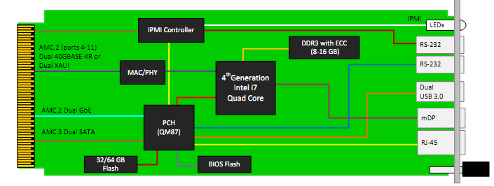 The AMC727 is a Processor AMC (PrAMC) in a single module, mid-size AdvancedMC (AMC) form factor based on the Intel® next generation CoreTM i7 Processor (Haswell) with QM87PCH.