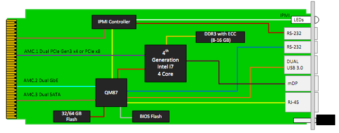 The AMC726 provides 16 GB of DDR3 memory with ECC and 32/64 GB of Flash for the OS. The BIOS allows booting from on board Flash, off-board SATA, PXE boot, and USB. There are dual USB for extended storage or peripherals.