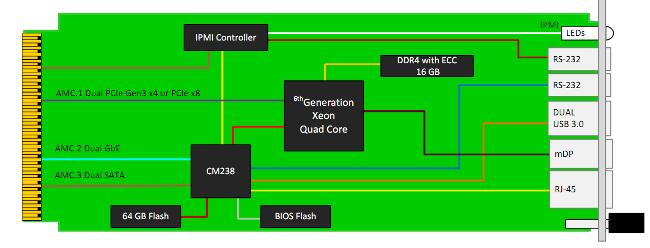The AMC756 is a Processor AMC (PrAMC) in a single module, mid-size AdvancedMC (AMC) form factor based on the Intel® Xeon® Processor E3-1505M v6 (Kaby Lake) with CM238 PCH. The processor base frequency is 3.0 GHz with max turbo frequency of 4.0 GHz. The module follows the AMC.1, AMC.2 and the AMC.3 specifications.