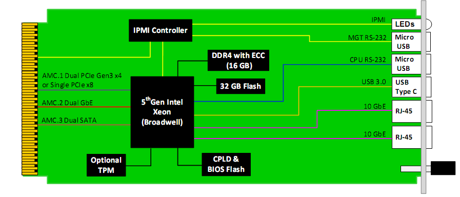 The AMC763 is a Processor AMC in a single module, mid-size, based on the Intel® 5th generation Xeon 4-core, 8-core or 16-core Processors (Broadwell). The efficient SoC design has low power consumption and integrated PCH technology. The module follows the AMC.1, AMC.2 and the AMC.3 specifications.