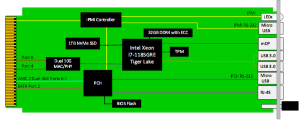 The AMC767 has up to 32GB of DDR4 memory with in-band ECC and 1TB of NVMe SSD for OS. The BIOS allows booting from onboard Flash, PXE, and/or USB.