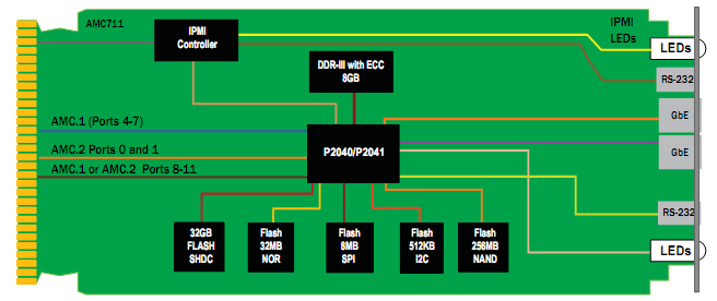 The AMC711 is a Processor AMC (PrAMC) in a single module, mid size AdvancedMC™ (AMC) form factor based on the Freescale P2040 or P2041. The module follows the AMC.1 and AMC.2 specifications. The PCIe interface is configurable as Host or Agent mode and it interfaces as dual x4 (ports 4-7 and 8-11). The P2041 has option to have ports 8-11 as XAUI (10GbE). The AMC711 has up to 8GBytes of DDR-III memory with ECC.