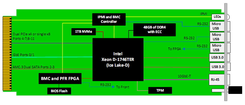 The Module provides dual PCIe x4 or single x8 on Ports 4-11 per AMC.1, GbE on Ports 0/1 to the CPU per AMC.2, and SATA on Ports 2 and 3 per AMC.3. The Module also provides 10GbE-T on the front panel.