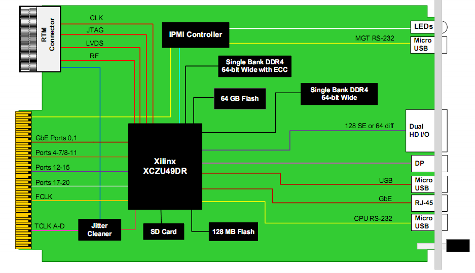 The RFSoC device includes 16 ADC (14-bit @ 2.5 GSPS) and 16 DAC (14-bit @ ~9.7 GSPS) with analog I/O routed to a MicroRTM per MTCA.4. Clock and trigger I/O are provided. The front panel also has the interface to the Display Port, single USB, RS-232 Ports as well as dual high-density connector for external I/O (total of 128 single ended or 64 differential).